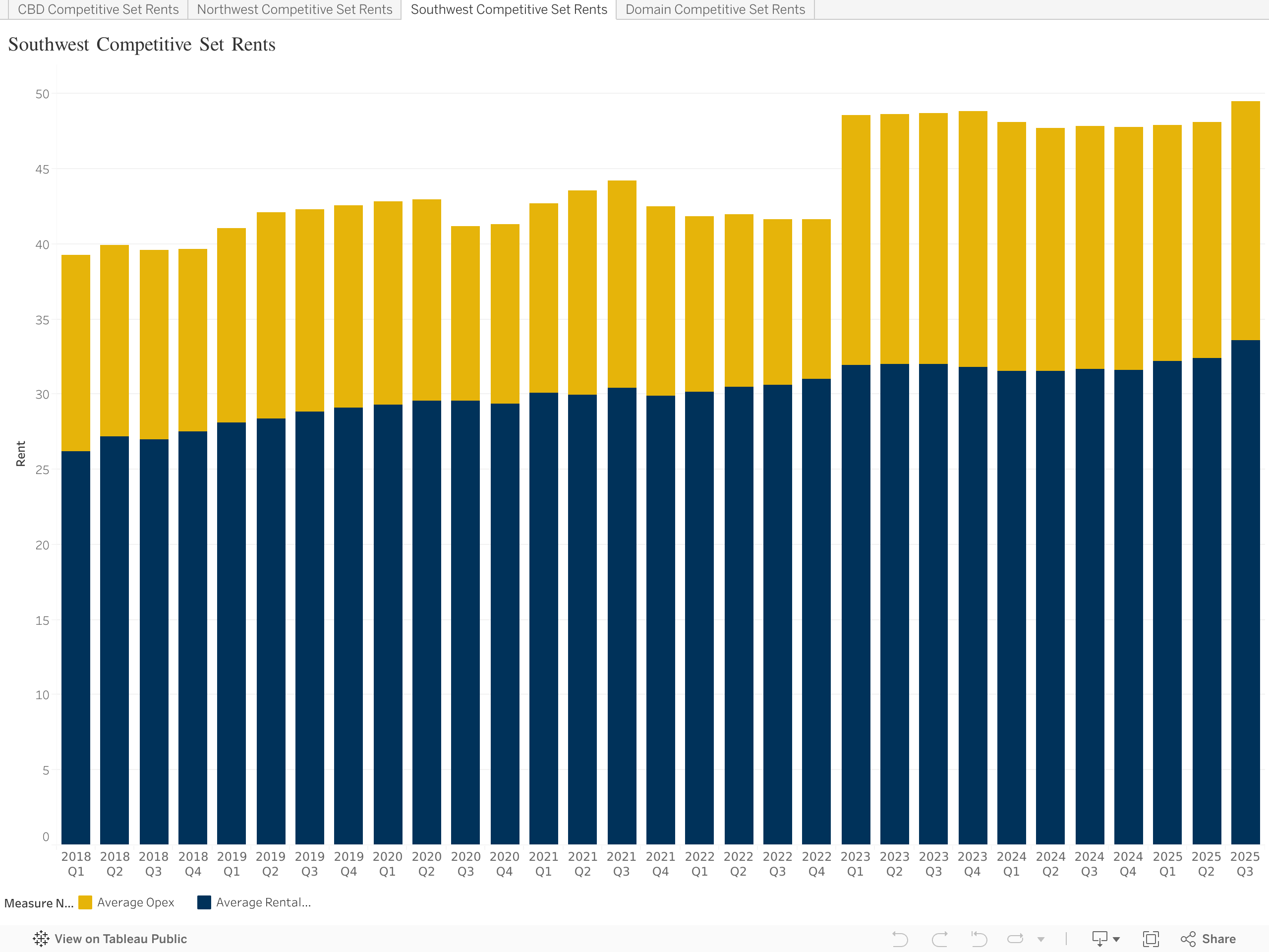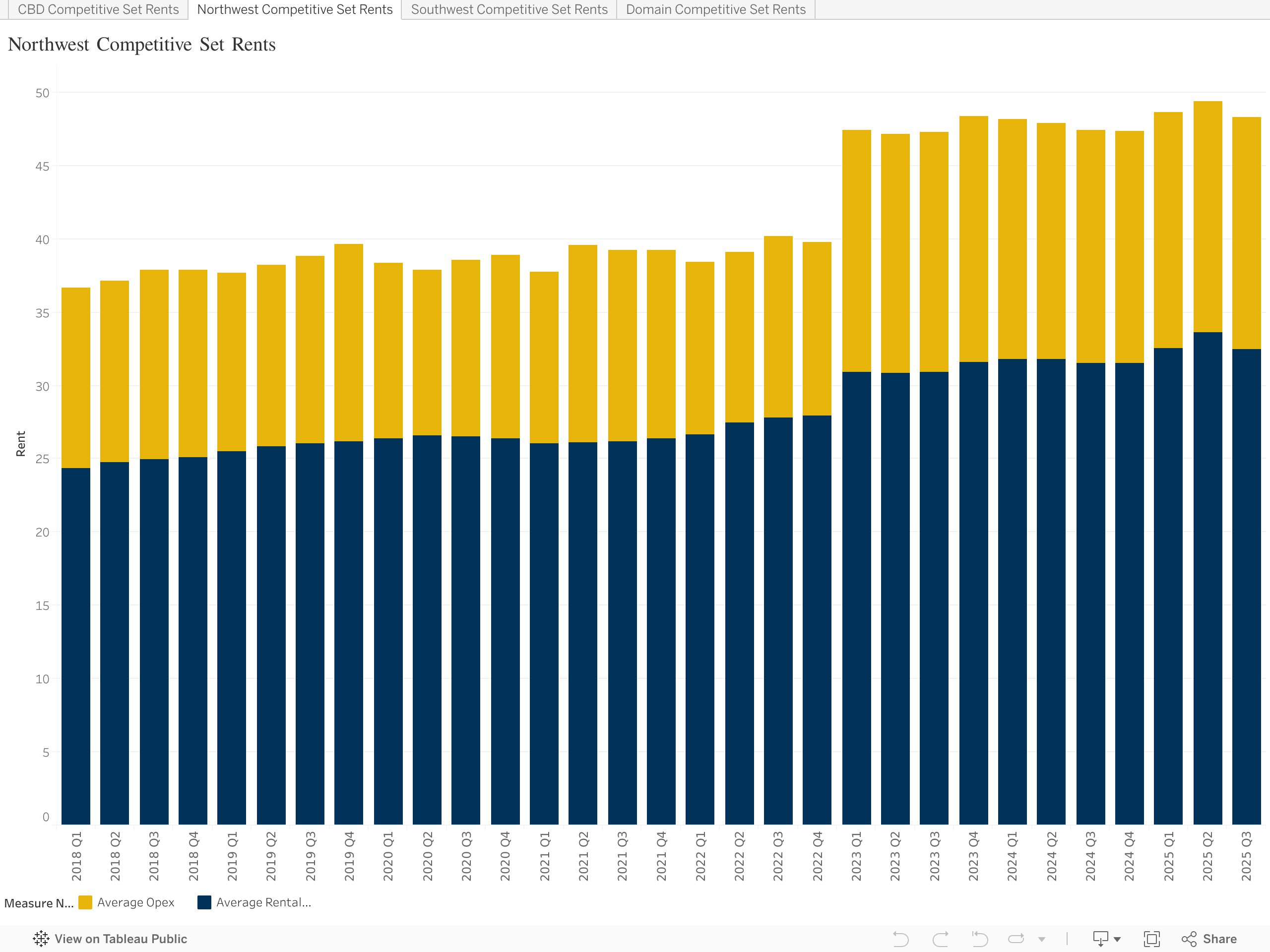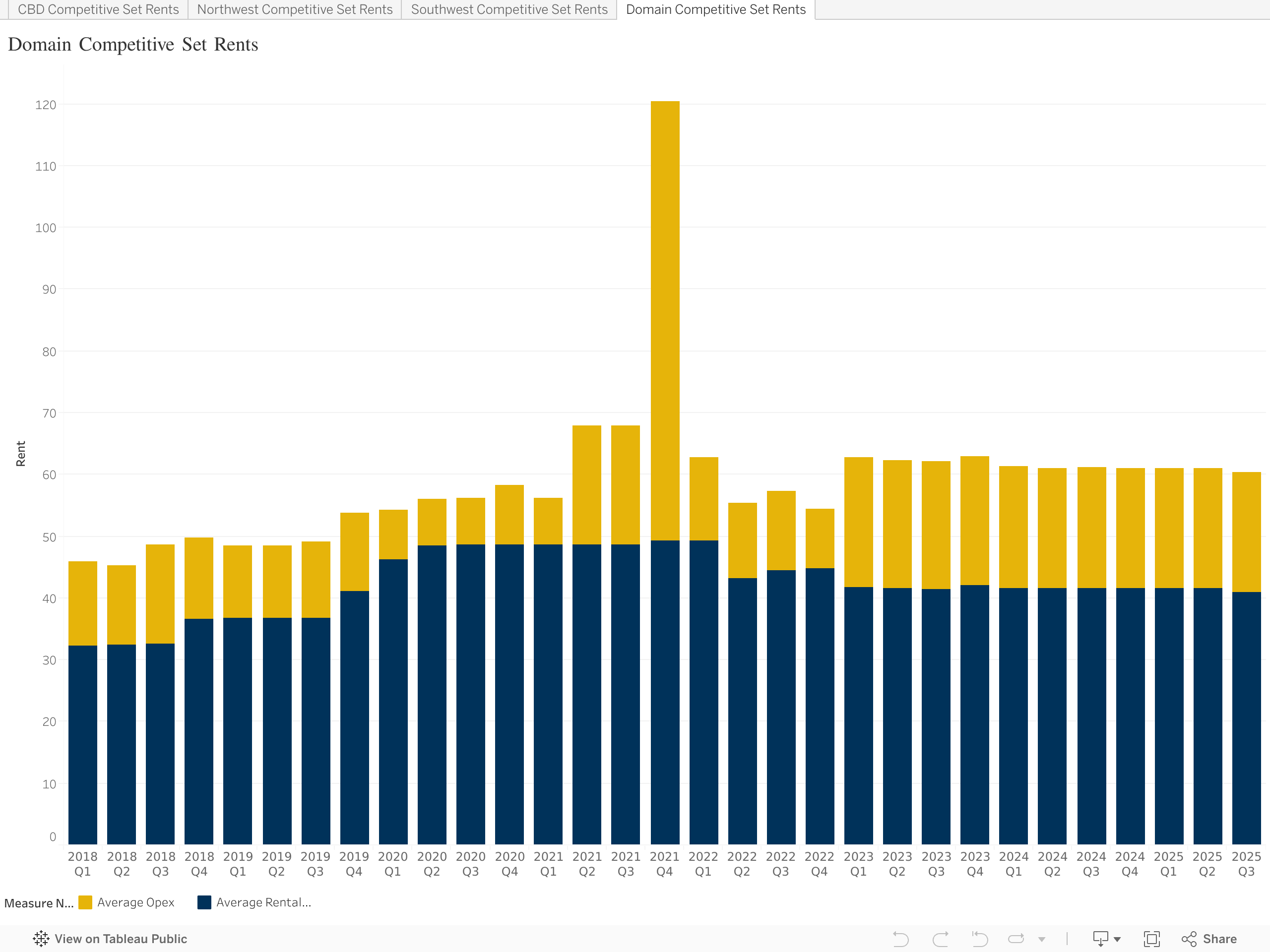 *This spike in Q4 2021 reflects a period when the competitive set had just one building with available space (Domain Place), which reported operating expenses of $75/SF amid an exceptionally tight market.